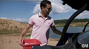 Emma Butt, the brunette with big tits, gets a blowjob and titty fuck in a car at the car wash.