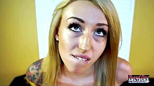 Slim Tattooed Blonde Jackie Swallows Hard Cock And Cumshot
